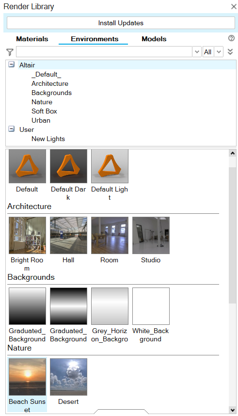 Tip: To find and open a tool, press Ctrl+F. For more information, see Find and Search for Tools.The Render Library is displayed. -