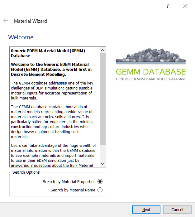Note: The GEMM Database contains only Multi-Sphere models. - On the Welcome screen, select the Search by Material Properties option and click Next.