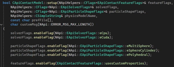 The EDEM API allows the author to enable or disable certain API functionalities through the use of flags in the setup function of either the Contact Model or Particle Body Force interface classes. As an API Author, you can use these flags to potentially save on memory or reduce processing time, as well as to prevent bugs or crashes caused by running with solvers or particle shapes that the API is not designed for. Flags are available for particle body force, contact models, solvers, and particle shapes.