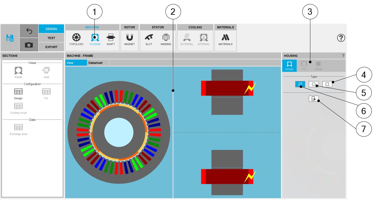 with the Housing: Frame, Fin and Cooling circuit. Note: By default, the section Frame is selected. |