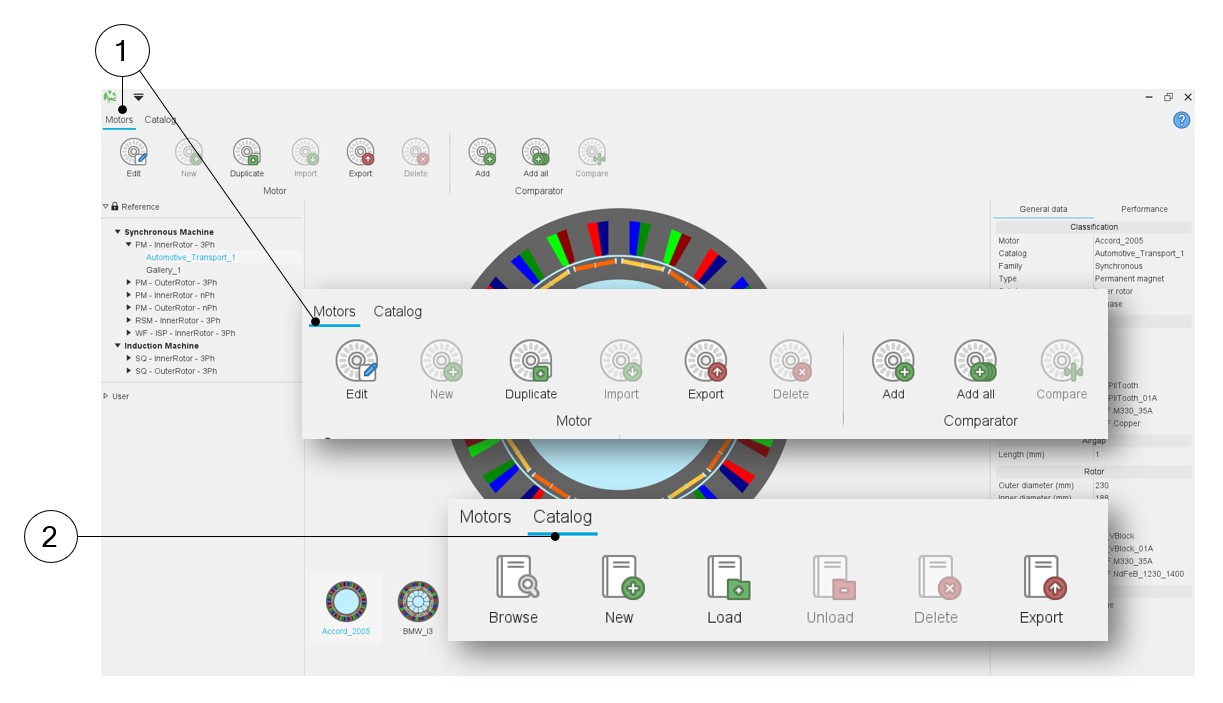 - The “Motors” area to visualize and manage all the motors stored in the selected catalogs