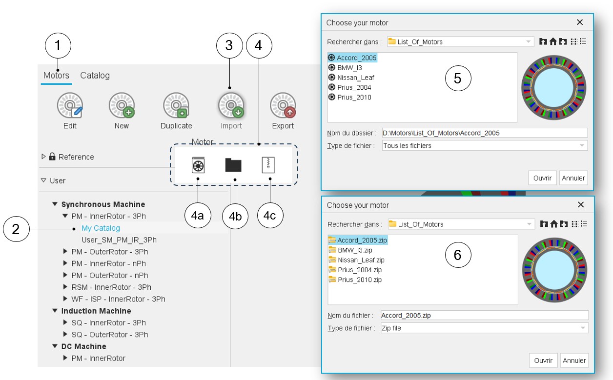 | 4a | 1st solution: Import motors from another catalog. Clicking on this icon allows access to the Motor Catalog via a dialog box to navigate through the various catalogs - reference and users - to select the motor to import. |