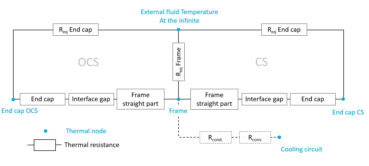 Three main paths extract the heat from the machine to the external fluid, corresponding to three main components: the straight part of the frame and the two end caps.