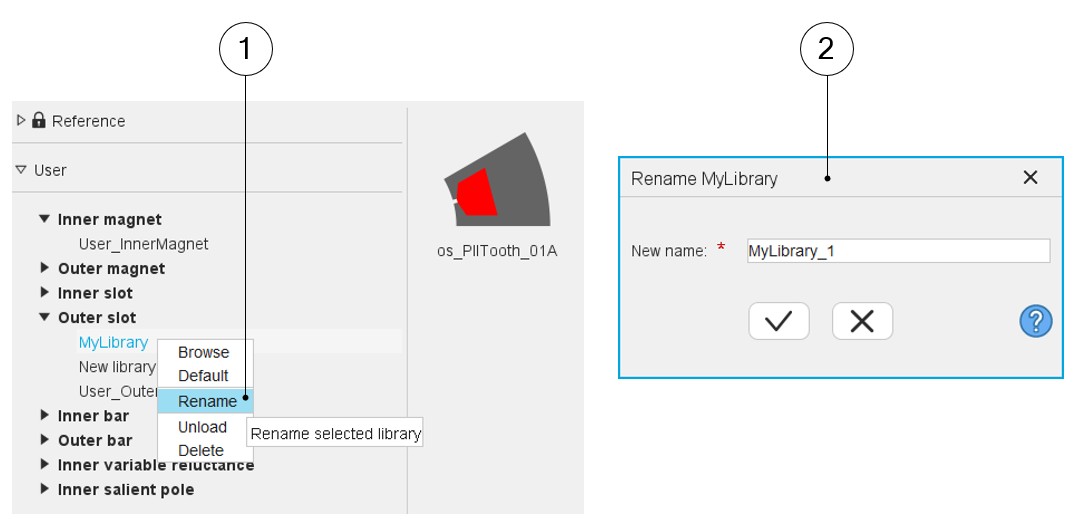 | 1 | Right Click on the library to be renamed. A drop-down menu appears with functions such as Browse, Default, Rename, Unload and Delete. Select Rename |