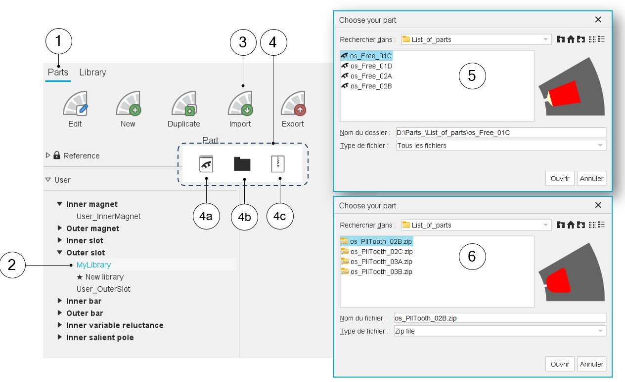 | 4 | Clicking on the icon "Import" opens a dialog box, allowing three ways for importing parts. |