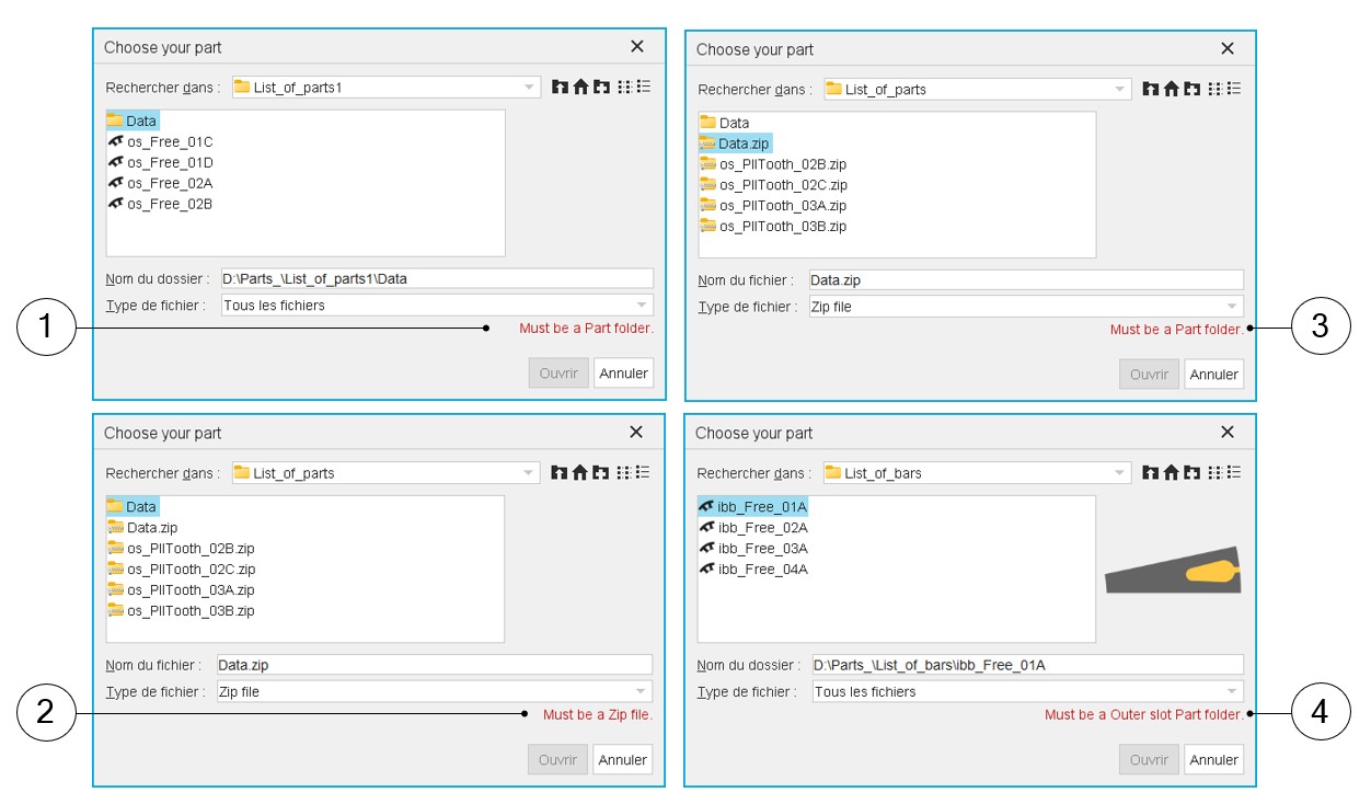 | 3 | When the selected zip file is not identified as a zipped part, a warning message is written in red (Must be a Part folder). |