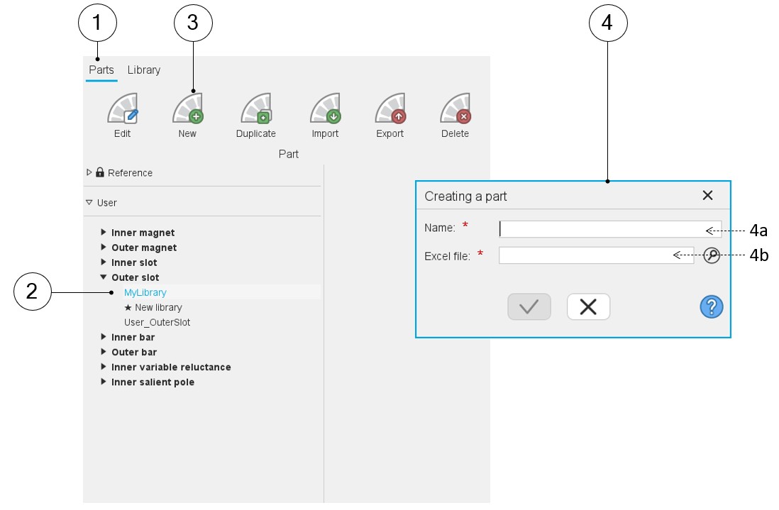 The creation of a new part is possible only in a user’s library. If you select a reference library, the icon "New" is disabled.