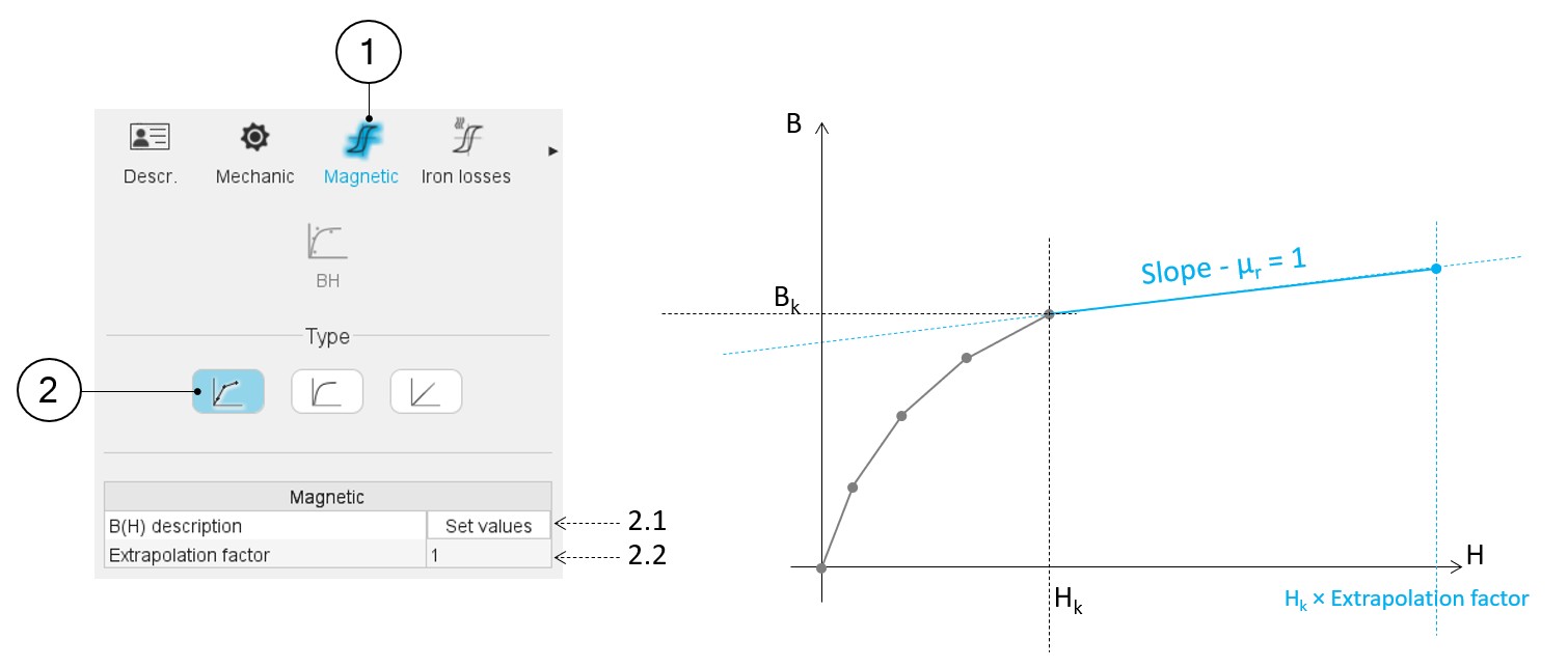 B(H) curve after the last point given by the user. The aim is to ensure that this slope is equal to 1 (i.e. relative permeability equal to 1). This coefficient is applied to the maximum magnetic field given by the user to define the very last point of the B(H) curve to be considered. The slope equal to 1 is applied to the segment between this point and the last one given by the user, as illustrated in the picture above. |