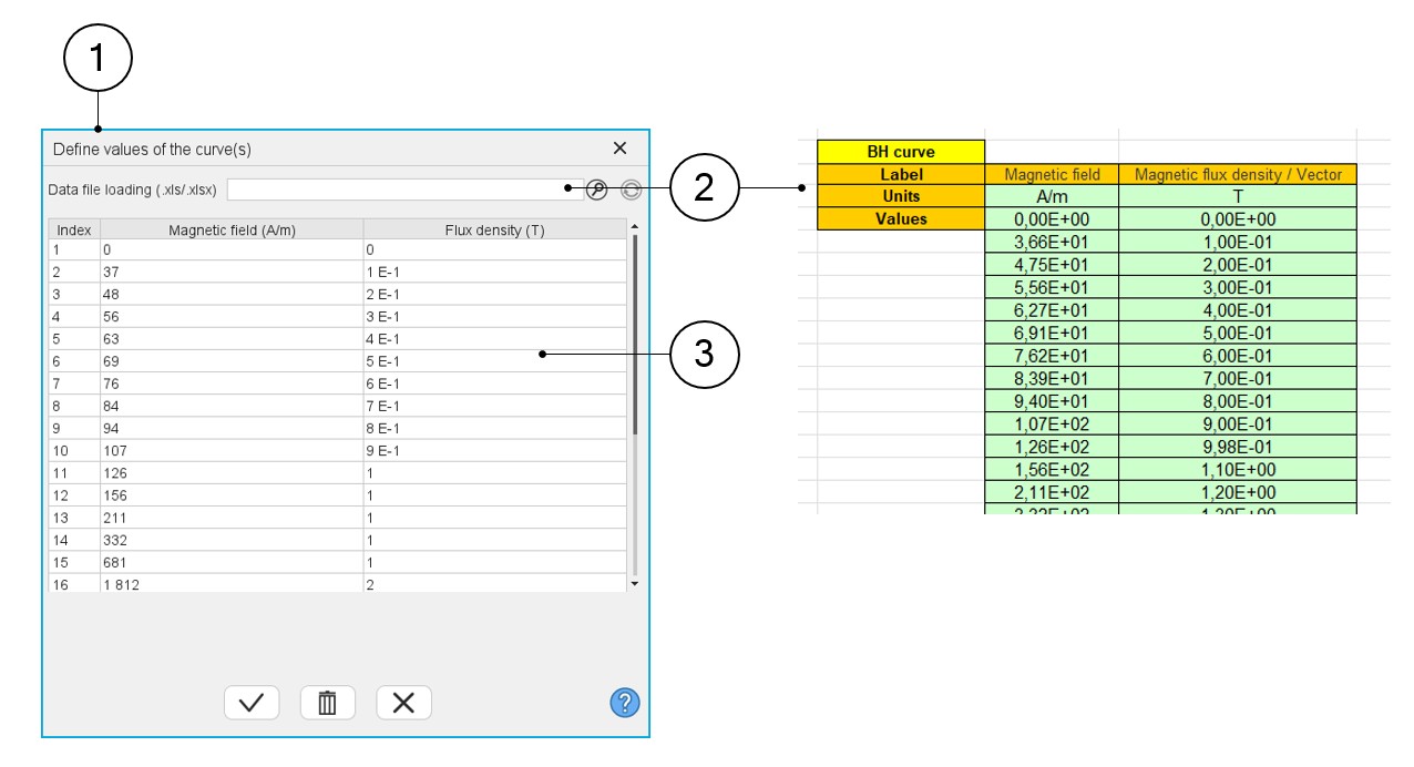 1 Button to fit the B(H) properties. Clicking on it opens the dialog box (2). 2 Dialog box allowing the characterization of the B(H) curve imported from an Excel file. 3 Icon, which corresponds to the option allowing to fit the data in an automatic way. 3.1 Field to browse and to select the path where the Excel file to be imported is stored. See an example of Excel file below. 3.2 In this field, two choices are available: - The automatic mode (Auto): The fitting process is entirely automatic for defining the input parameters for the B(H) curve.