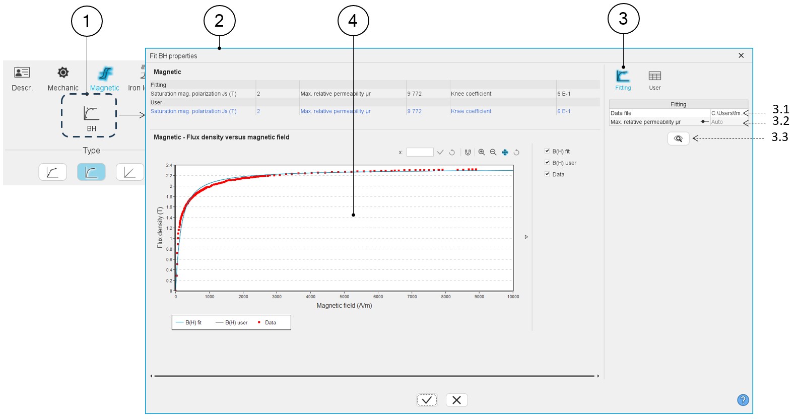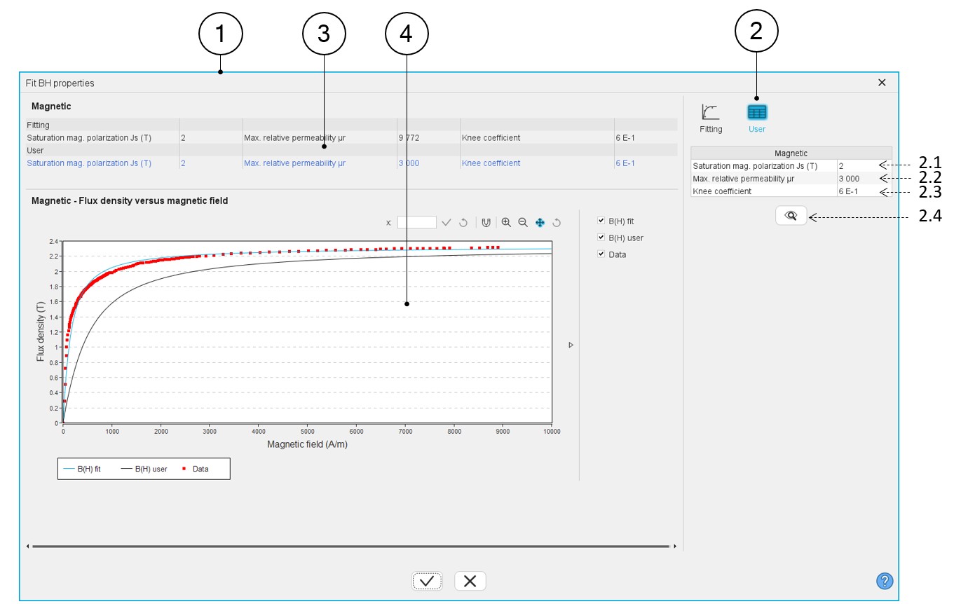 1 Dialog box allowing the characterization of the B(H) curve imported from an Excel file. 2 The user can adjust one or all three main characteristics of the B(H) curve: Js, µr and a. To do so user tab must be selected by clicking on its icon.The resulting modification is directly displayed on the graph (4) and in the magnetic properties (3). 2.1 The magnetic polarization at saturation (Js) 2.2 The maximum relative magnetic permeability (µr) 2.3 The knee coefficient (a) 2.4 Accept the user values modification by clicking this button. 3 The main data of the B(H) curves are displayed: In blue they correspond to the user’s inputs; in black these are the resulting values after the fitting process.