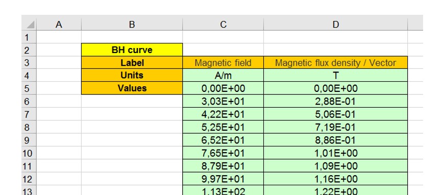 Figure 1. Example of an Excel file to define the B(H) curve parameters