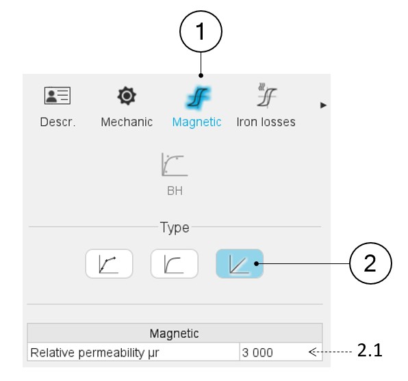 | 2 | Selection of the linear B(H) model. The linear B(H) characteristic of a lamination is considered, and the slope of the B-H curve must be provided. |