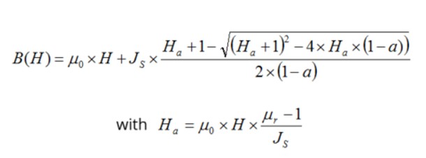 1 When editing the properties of an existing material (lamination and solid families), a category is dedicated to the magnetic data. Hence, clicking on the “Magnetic” one can define the B(H) curve. 2 Selection of the nonlinear analytical B(H) model. The three coefficients of the nonlinear analytical model must be provided. The three main parameters of magnetic characteristic and the analytical formulae to create a B(H) curve are illustrated below. 2.1 The magnetic polarization at saturation (JS) 2.2 The maximum relative magnetic permeability (µr) 2.3 The knee coefficient (a) 3 Another method is possible to define the nonlinear B(H) curve of a material. If the user has measurements or computation points representing the B(H) curve to be modelled, it is possible to import these data to define the corresponding characteristics.