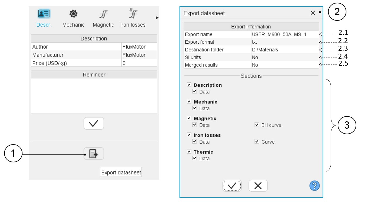| 1 | Button to open a dialog box to define and export datasheets dealing with the considered material. |