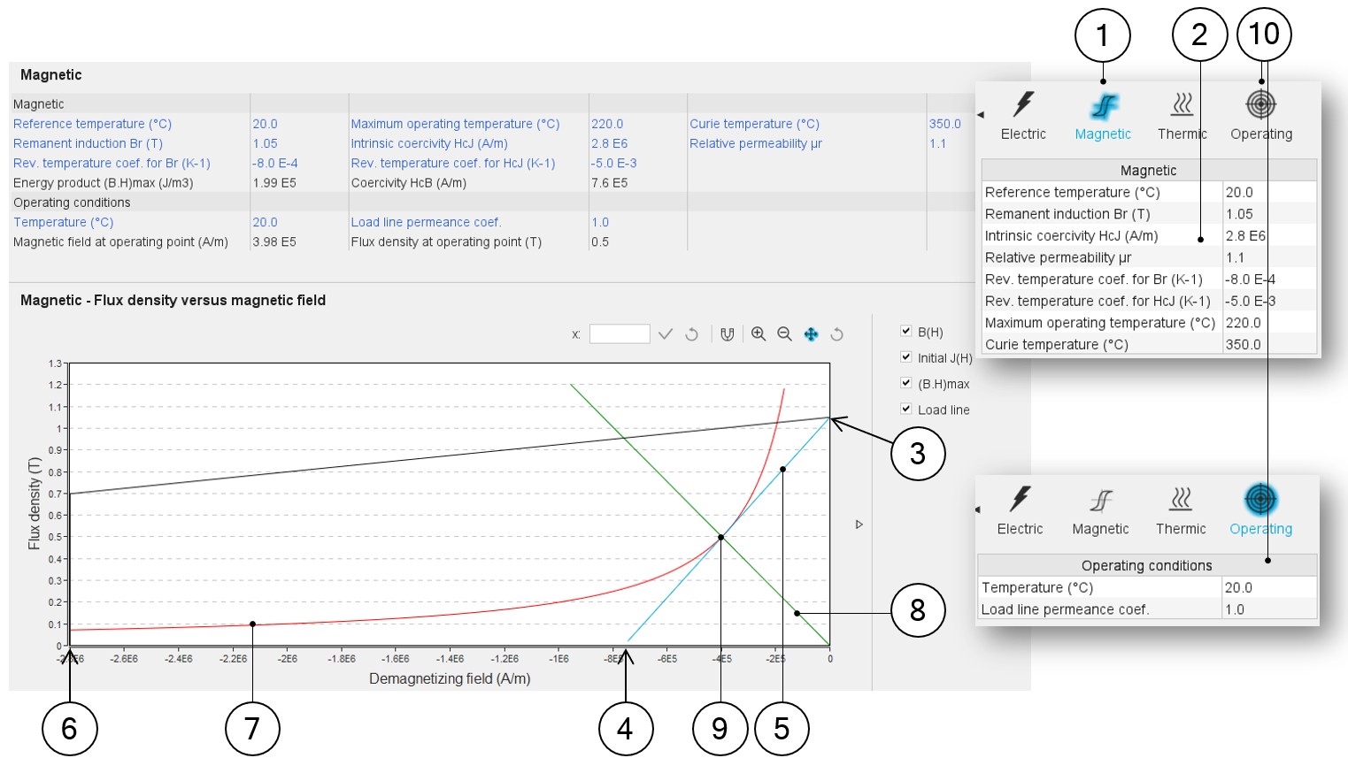 | 9 | Operating point for the given permeance coefficient and temperature. |