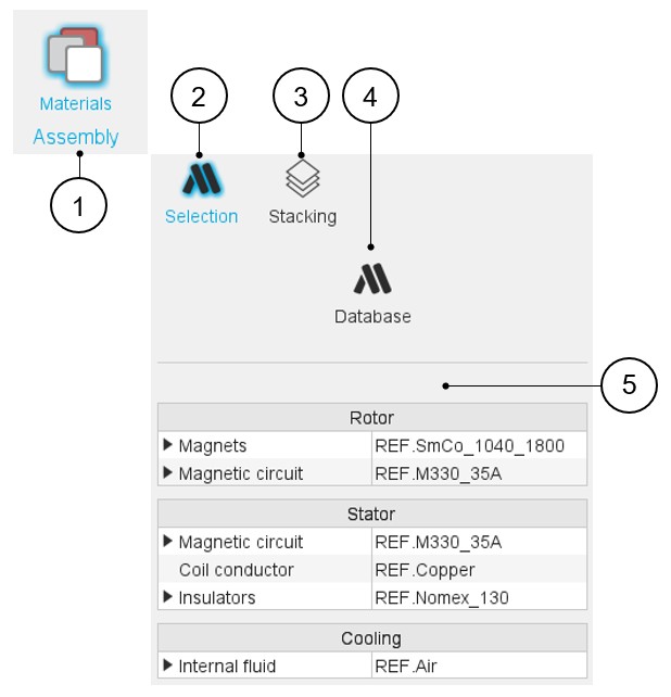 In the Motor Factory – Design area, the environment “Assembly - Materials” allows to assign materials to the different regions that make up the considered machine.