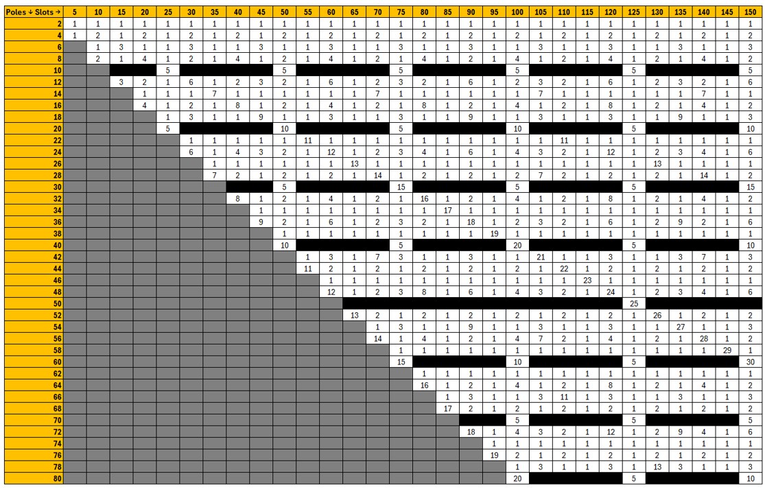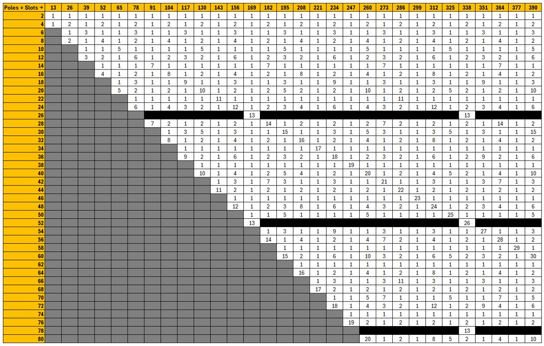 - The numbers indicated in the other cells correspond to reduction coefficients to the resulting model in Altair Flux. For example, “1” means that the whole geometry is represented. “2” means that only half of the machine is represented, and “n” means that the 1/nth of the geometry is represented in the Altair Flux environment. That means, it gives a general idea of the size of the model in Altair Flux software. Higher value gives the reduction coefficient and faster computation for a given motor.