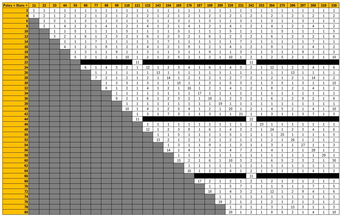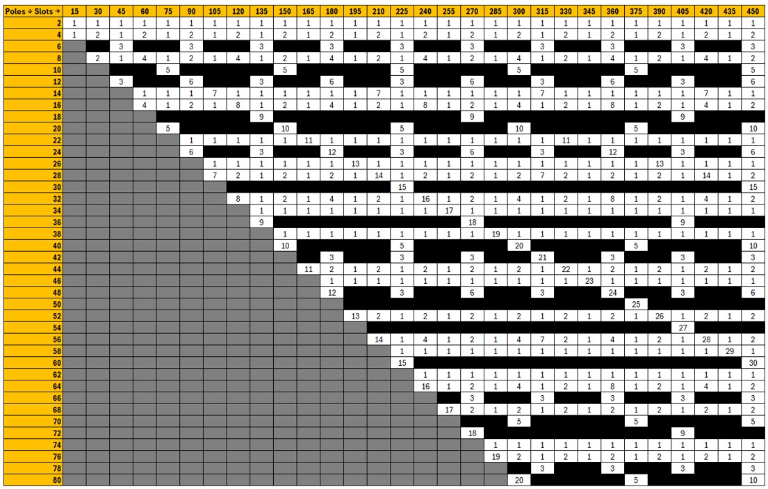 Three tables representing a selection of combinations of number of poles and number of slots for the most typical number of phases (three, five and seven) are presented below.