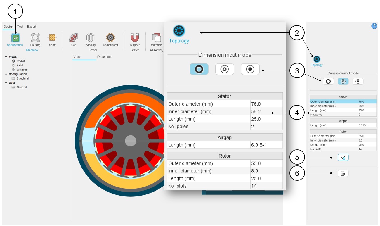 | 2 | Select the topology section for defining the structural data of the machine, meaning the main overall dimensions (stator and rotor outer and inner diameters) and characteristics like the number of slots, poles. |