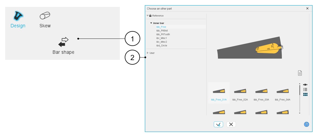 | 2 | Dialog box to visualize and to select the topologies of bars from the bar part libraries. |