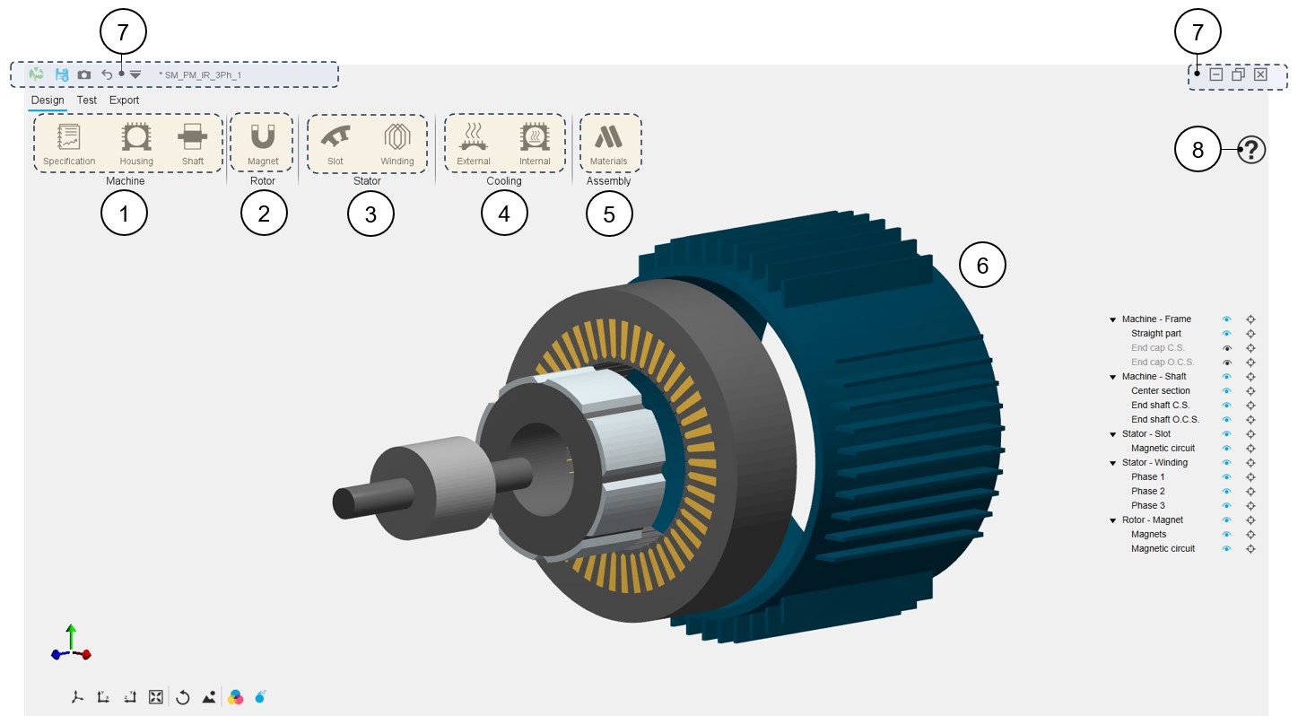 | 2 | Rotor section - Access to the main functions to design the rotor and its corresponding subsets depending on the type of machine. |