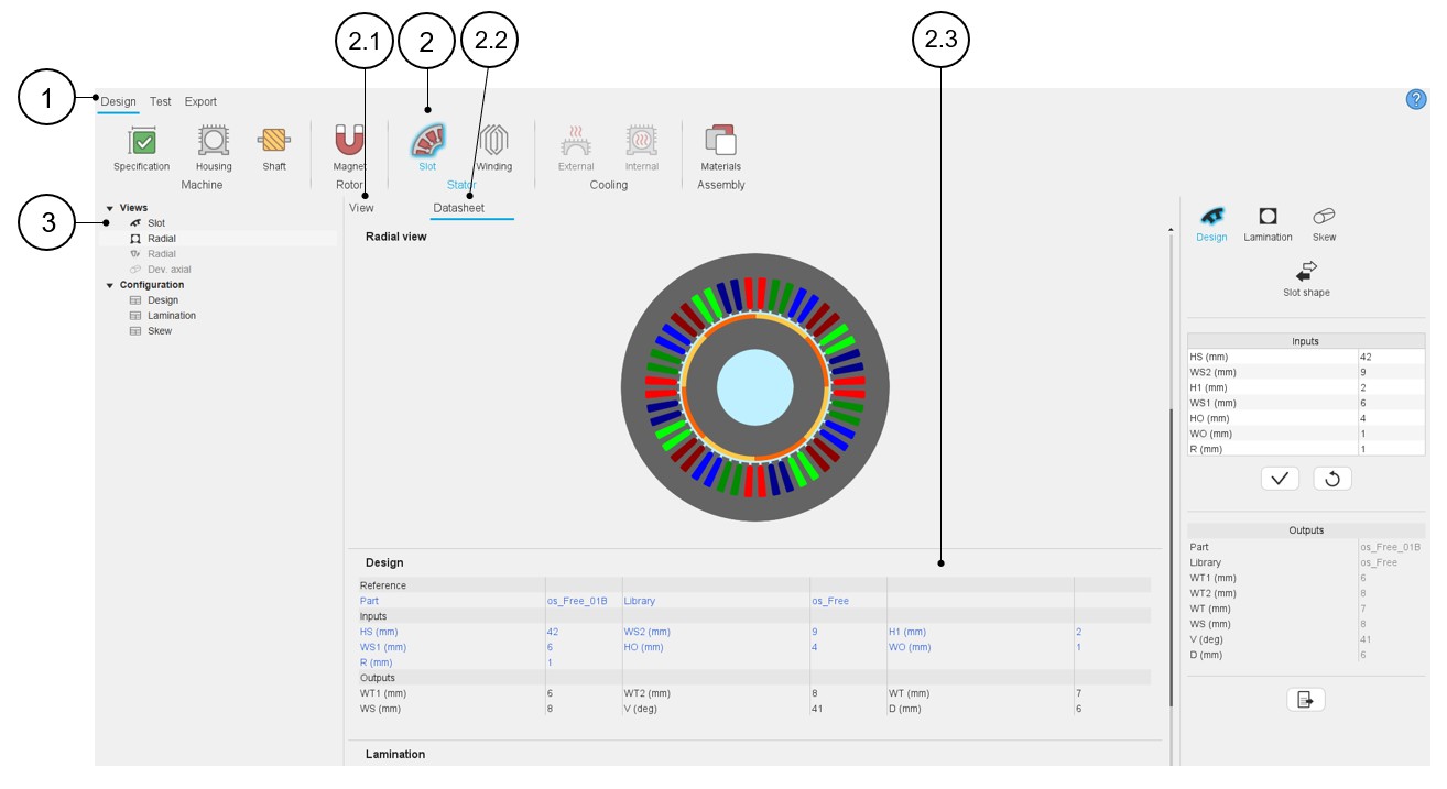 The aim of the GUI and workflow of the Motor Factory – Design area is to give a design guideline with a series of design cells to build the machine step by step. An overview of the Motor Factory – Design area is presented in the picture below.