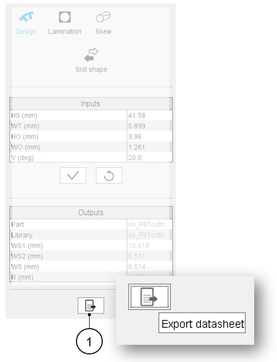 In the Motor Factory – Design area, whatever is the considered context of design for the machine, rotor, stator, cooling or materials, it is possible to export data that define the design of the machine. In each context, on the bottom part of the user inputs, one finds a button (Export datasheet) that opens a dialog box that helps the user to select and to export datasheet in a *.txt or *.xlsx format.