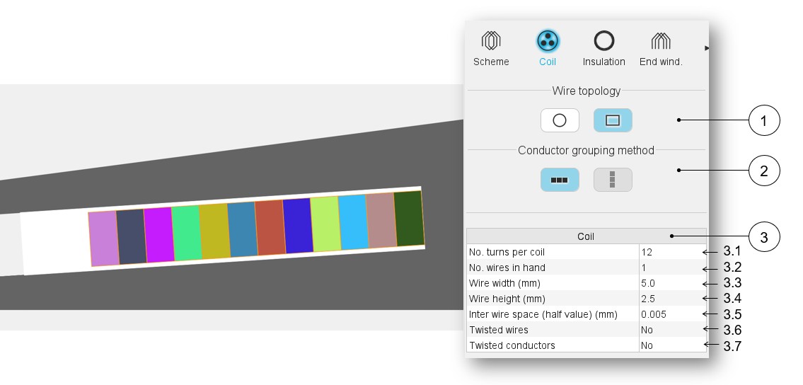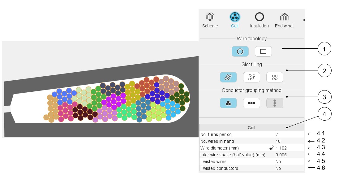 | 2 | Choice of the method to group the elementary wires. Two ways allow to fill the slot: Horizontal and Vertical. See the next sections which illustrate the grouping methods. |