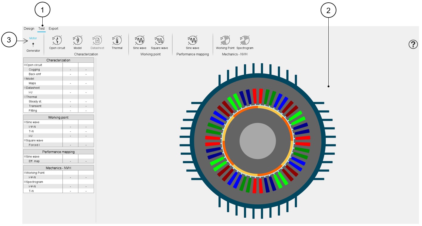 - The DESIGN area to design the motor (topology, winding, materials etc.).