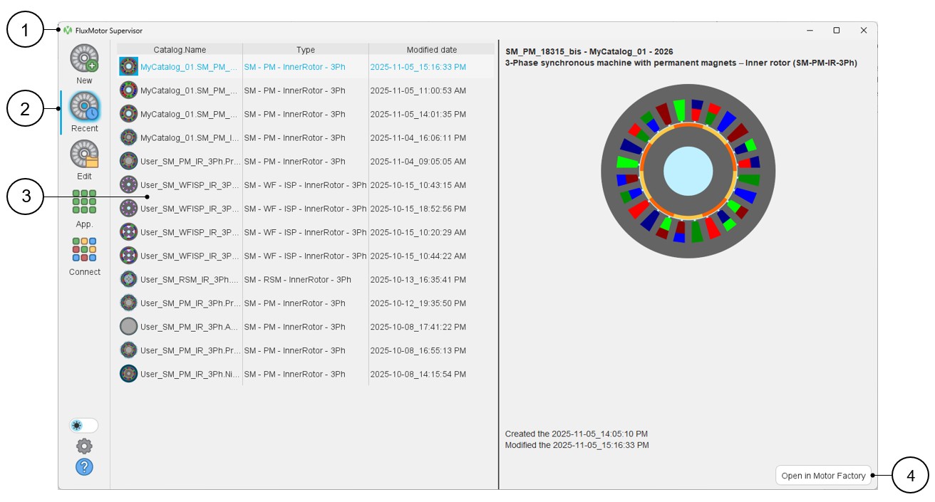 1 Open the supervisor 2 Selection of the recent motor list 3 Select the targeted recent motor. Once selected the recent motor can be opened in Motor Factory by double clicking on the corresponding line. 4 Once selected, the recent motor can be opened in Motor Factory by clicking on the button “Open in Motor Factory”. Note: Up to 100 projects can be stored on this list. - From the supervisor, open the motor to be designed by editing a motor in a