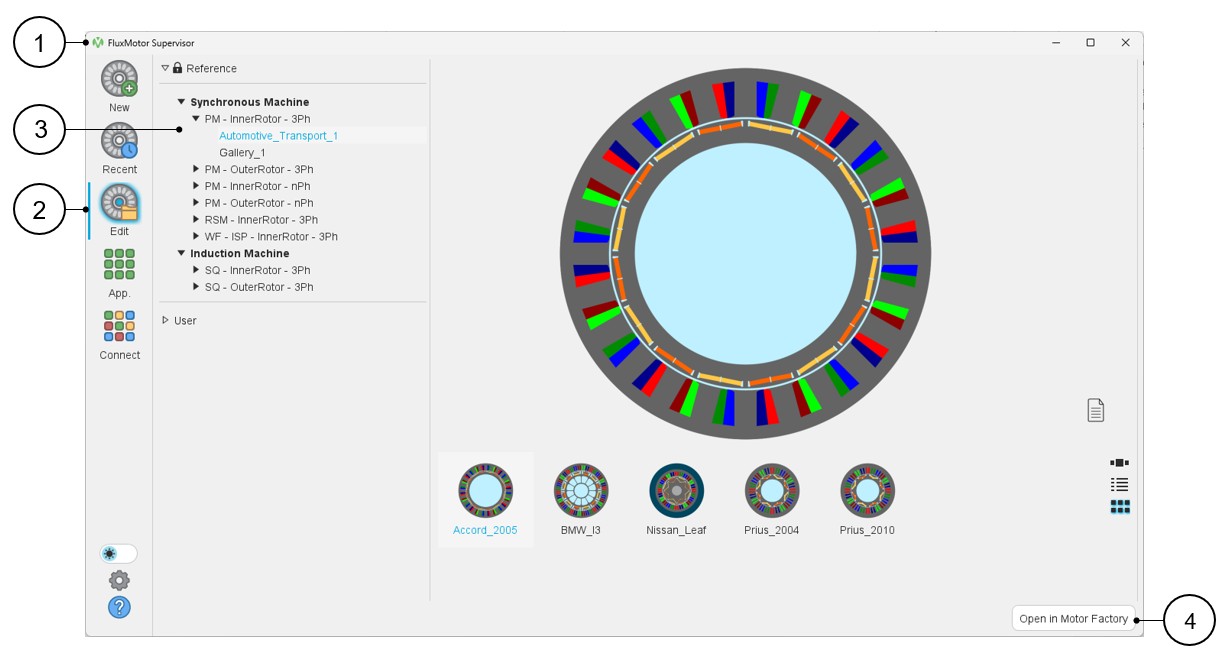 1 Open the supervisor 2 Selection of the targeted machine family – Synchronous, Induction (3), DC (4) 2.1 In the synchronous machine family, one can access the 3-Phase synchronous machine with permanent magnets (inner and outer rotor) – and the n-Phase machine as well. 2.2 In the synchronous machine family, one can access the 3-Phase reluctance synchronous machine (inner rotor). 2.3 In the synchronous machine family, one can access the 3-Phase wound field synchronous machine (inner rotor). 2.4 Once selected, the motor can be opened in Motor Factory either by clicking on the corresponding icon or by clicking on the button “Open in Motor Factory”. 3 Selection of the induction machine family 4 Selection of the DC machine family - Synchronous machines