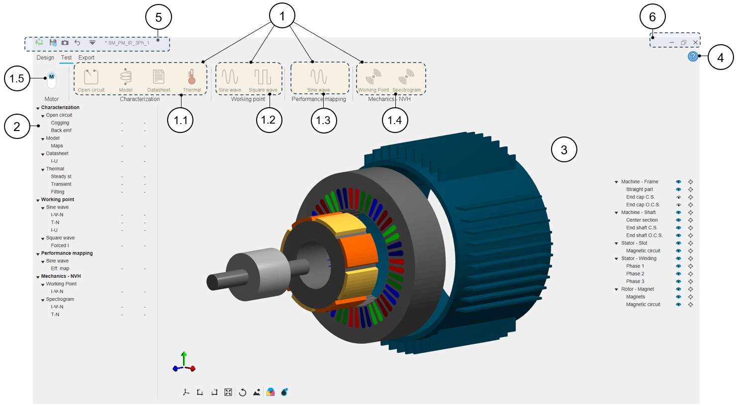In the Motor Factory Test environment, standard tests are ready to be performed. The GUI allows fulfilling all the steps needed to perform the test with customized settings. An overview of the Motor Factory – Test area is presented in the picture below.