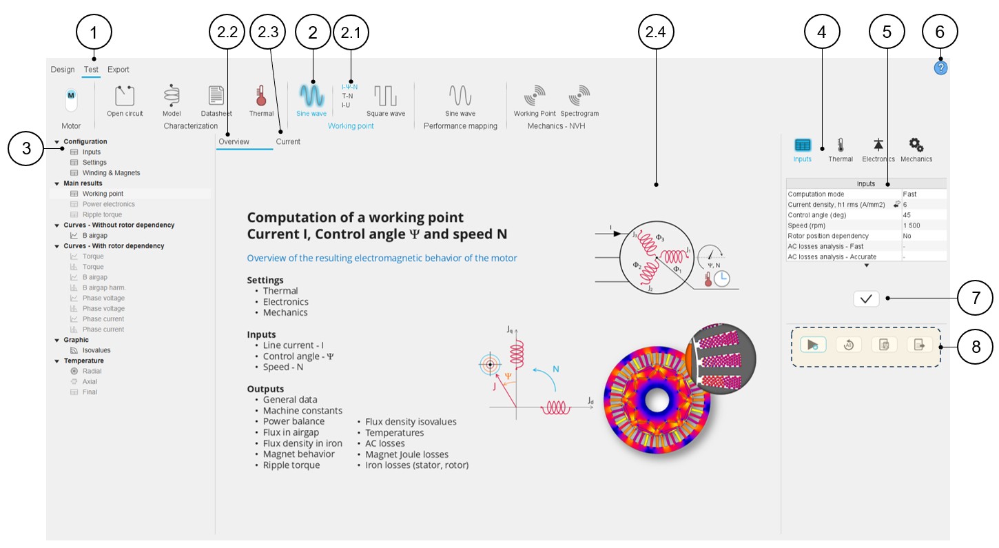 In the Motor Factory Test environment, standard tests are ready to be performed. To select and perform a test, first one must click on a test package belonging to a test family. In the example below, one selects the test package "Sine wave" of the working point test family. Among the list of available tests, one selects the computation of a working point defined by the current (I), the control angle (Ψ) and the speed (N). See the various elements of a test page below.