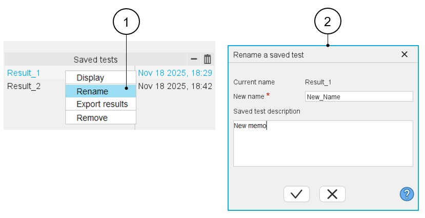 2 The test result is displayed in a new tab inside the test results zone. 3 Displaying edited results (saved and current results) is possible by clicking on the corresponding tabs. Several saved tests can be displayed. 4 Note: Other functions available in this list box are:The selected test result can be renamed (Rename), exported (Export results - see next section) and removed (Remove).