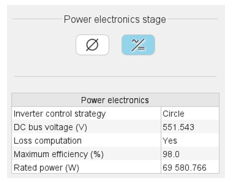 This parameter defines the maximal efficiency that the power electronics stage can reach. This efficiency can correspond to the efficiency of an inverter or a variable speed drive.