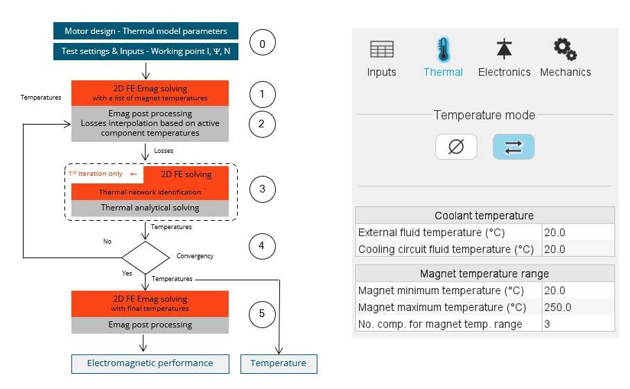 4 Iterative process = loop between the interpolation of losses and the thermal computations until the convergence on the temperature is reached (See below where the convergency criteria can be adjusted, if needed). 5 A last electromagnetic solving (Finite Element computation) with final set of temperatures is performed once the convergence on the temperature is reached (1). Electromagnetic performance and chart of temperatures are computed and displayed.
