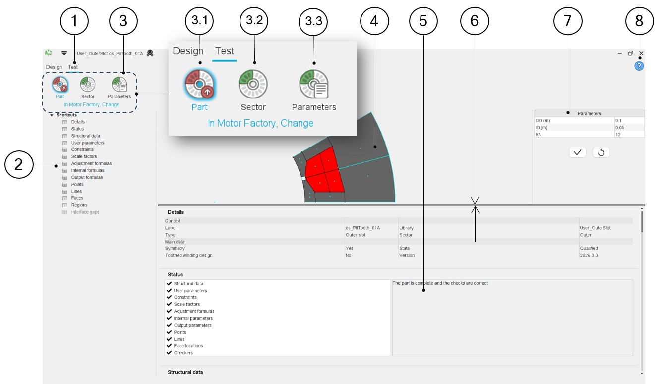 In Part Factory, the Part function of the test area allows testing the capability of the considered part to be imported in Motor Factory and by considering the sector defined with specific structural data.