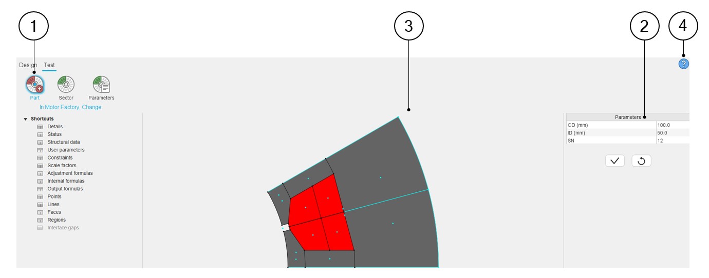 In Part Factory, the Part function of the test area allows testing the capability of the considered part to be imported in Motor Factory and by considering the sector defined with specific structural data.