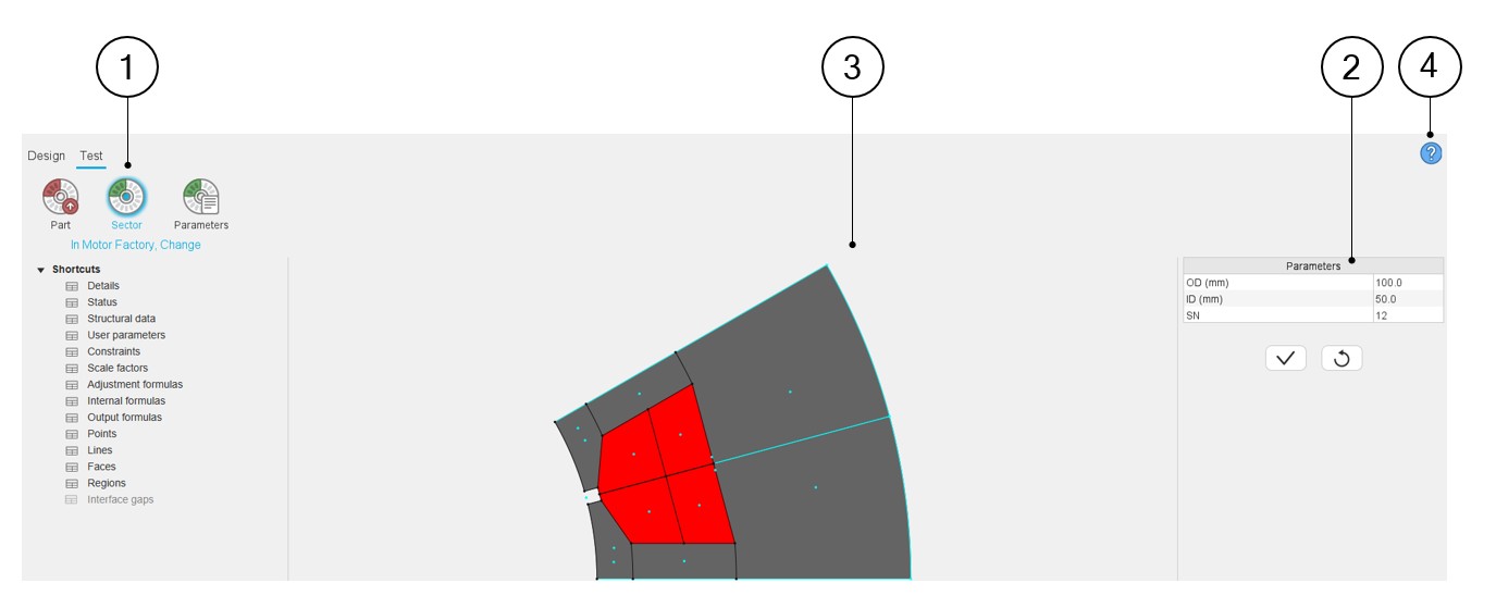 change of the sector in the Motor Factory. It allows testing how the considered part interacts with the structural data of the reference sector in which it is defined. The user input parameters are the main three dimensions of the sector defined in zone 2. |