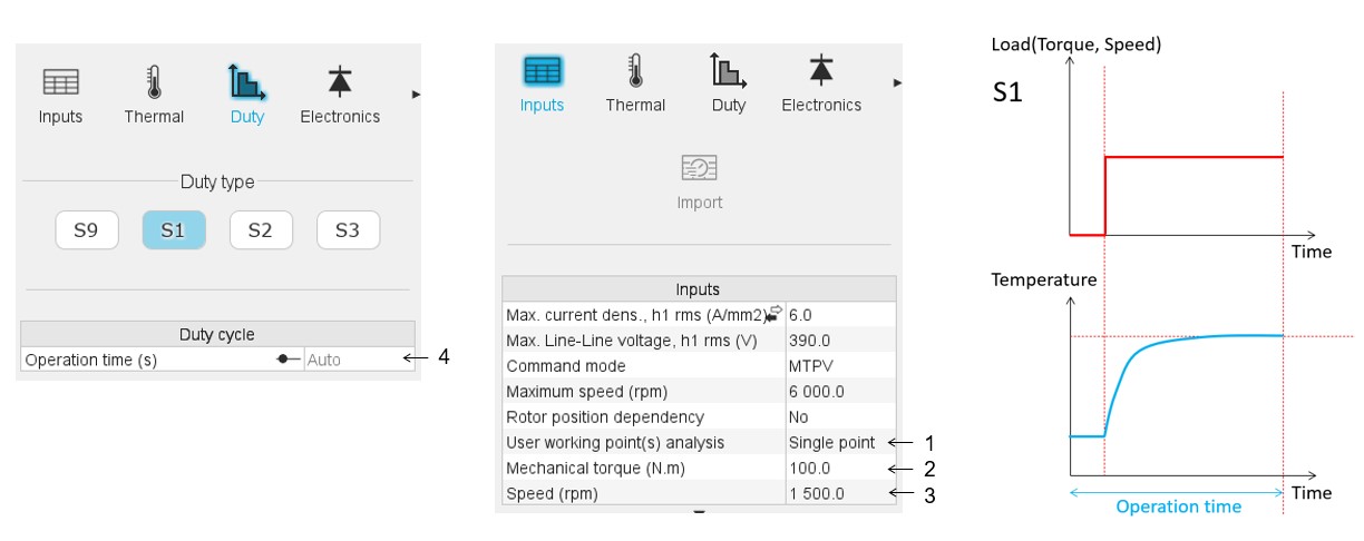 - For S1 and S3, automatic cycle duration estimation is available based on the thermal time constant of the machine (typically 5× time constant), ensuring sufficient time to reach steady-state or periodic stability.