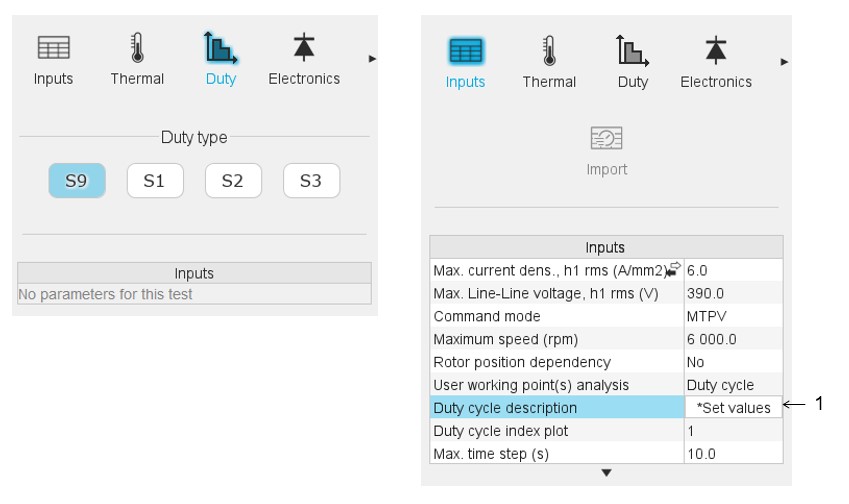 This duty cycle must be defined by using the field: "Duty cycle description" and by clicking on the button "Set values" (index 1 in the image above)