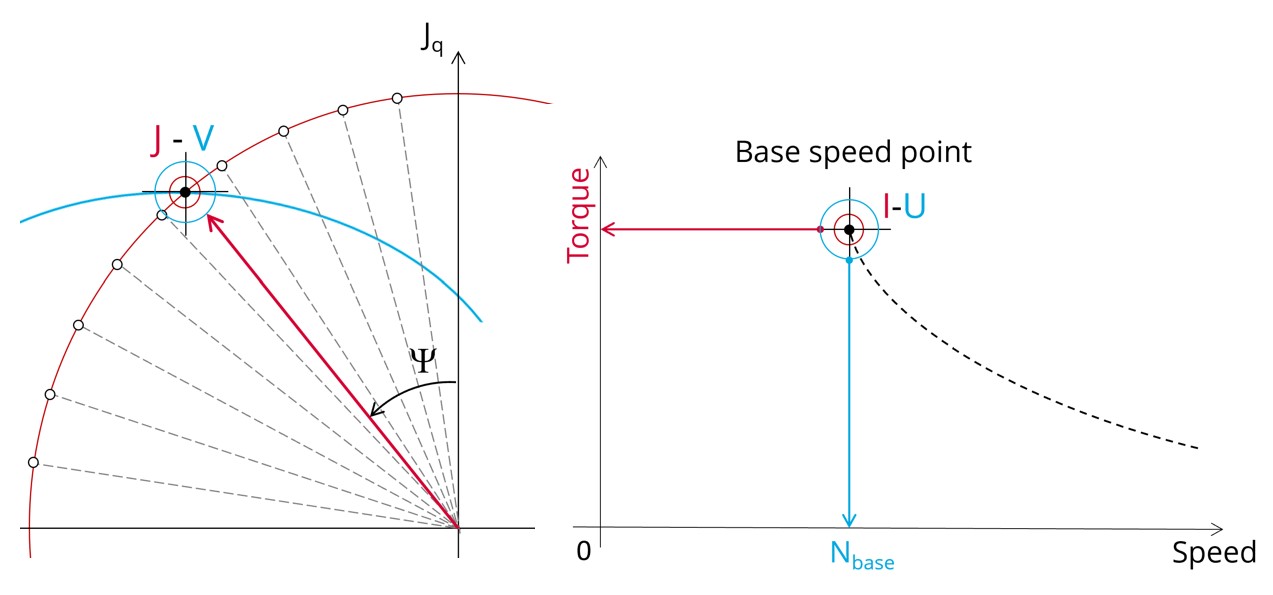 The aim of the test “Characterization - Datasheet – Motor – I, U” is to characterize the behavior of the machine when operating at the working point that is located at the base speed point.