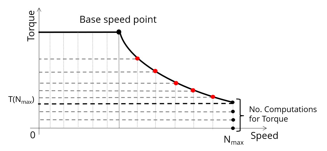 For the speed range [Nbase; Nmax.], the number of computations for torque is imposed by the number of computations for speed in the speed range [Nbase; Nmax.] (Red points in the image shown below).
