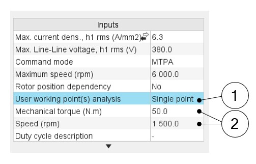 1 Select the “Single point” option to perform a computation on one working point. 2-3 Define the targeted working point mechanical torque and speed. - User working point(s) analysis = Duty cycle