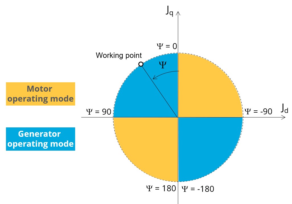 The relative angular position between the axis of the stator phase 1 (reference phase) and the rotor D-axis position must be controlled to perform the tests. See the picture below which will allow defining the working point of the machine.