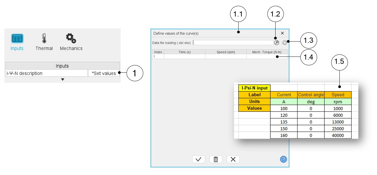1 lick on the button “Set values” of the field “ I, Ψ, N description” to define the working points in a dialog box. Refer to the next illustration which shows how to fill the working point table. 1.1 Dialog box opened after having clicked on the button “Set values” in the field “Cycle description” 1.2 Browse the folder to select an Excel file which describes the duty cycle. 1.3 Button to refresh the table data when the considered Excel file has been modified. 1.4 Fields to be filled with data to describe the duty cycle to be considered. 1.5 Excel file template to define the duty cycle