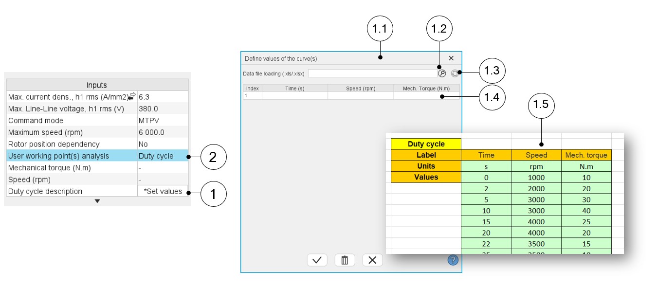 1.1 Dialog box opened after having clicked on the button “Set values” in the field “Cycle description” 1.2 Browse the folder to select an Excel file which describes the duty cycle. 1.3 Button to refresh the table data when the considered Excel file has been modified. 1.4 Fields to be filled with data to describe the duty cycle to be considered. 1.5 Excel file template to define the duty cycle Note: The Excel template used to import a duty cycle is stored in the folder Resource/Template in the installation folder of FluxMotor. An example of this template is displayed below.