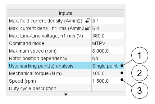 1 Select the “Single point” option to perform a computation on one working point. 2-3 Define the targeted working point mechanical torque and speed. - User working point(s) analysis = Duty cycle