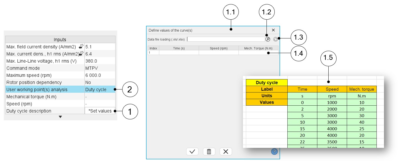 Two ways are possible to fill in the table: either filling in the table line by line or by importing an excel file which all the working points of the duty cycle are defined.Note: A working point is defined by a time, a speed, and a mechanical torque.