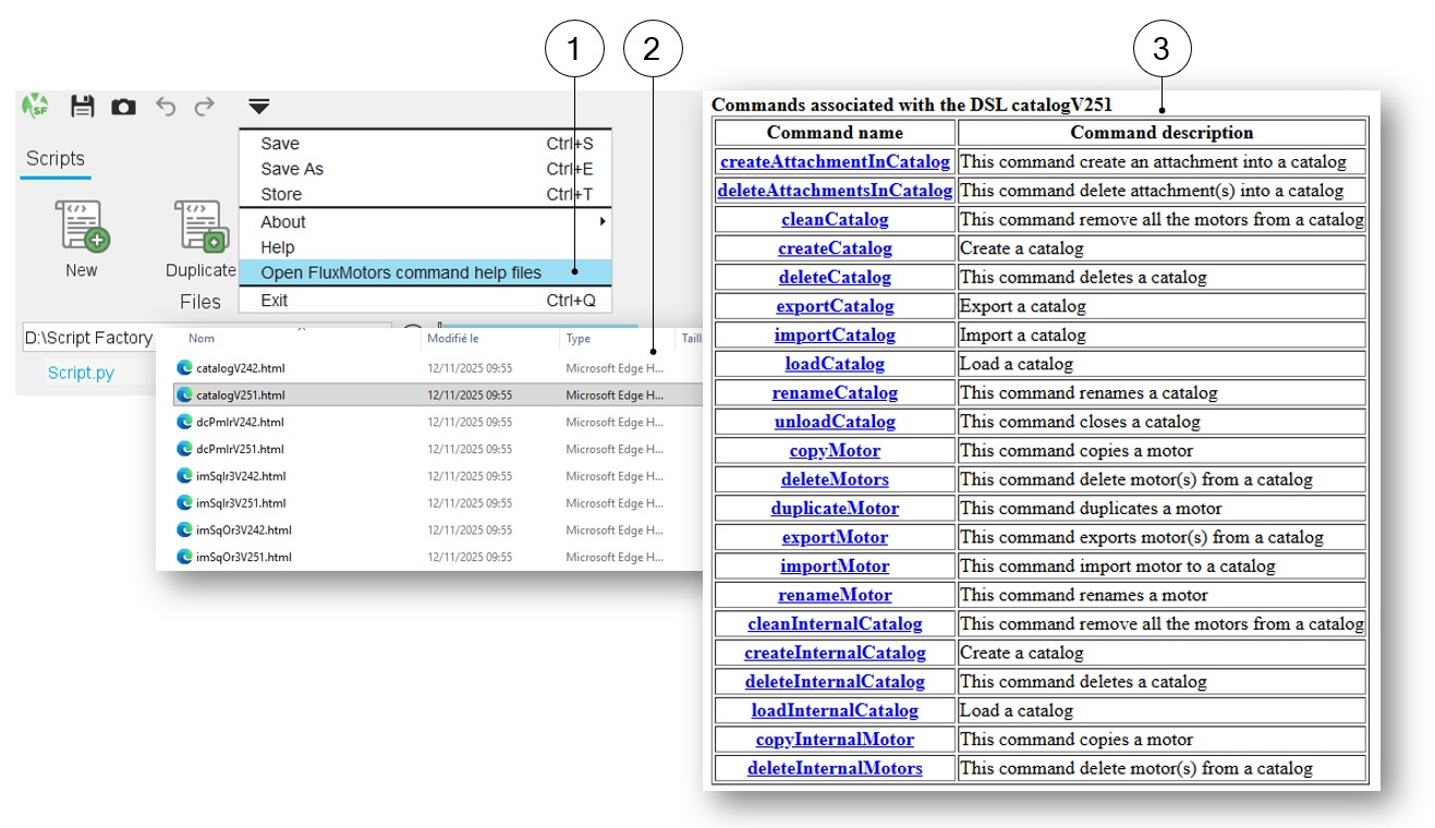 This section corresponds to the command “Open FluxMotor command help files” available in the expanding menu at the top part of Script Factory.